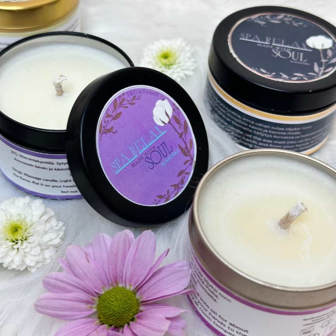 SpaRelaxSoul's natural massage candle offers a luxurious moment of calm and care. When lit, the candle melts into a silky massage oil that is nourishing, warm and aromatic.